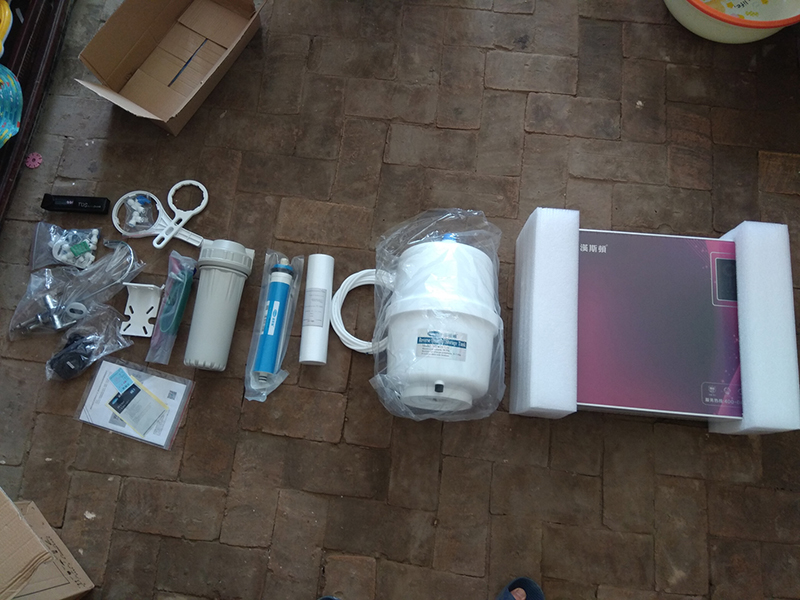这个是包装箱内所有东西,包括工具,2分管,滤芯,前置过滤,压力桶,最应该表扬的地方就是2分管的配件齐全,三通,开关,龙头什么的,太令人感动了,不用再花一分钱就全装起来了,对了,还送了一支TDS笔,这个我应该普及一下这个TDS值:简单的说,值越小,水越纯,我们喝的娃哈哈水的TDS值是1,因为娃哈哈水是纯净水,龙夫山泉在的TDS值在35左右,因为是山泉水含有益矿物质,那么本机的的把井水处理后的值是多少呢?此处留下悬念,接着看。。。。